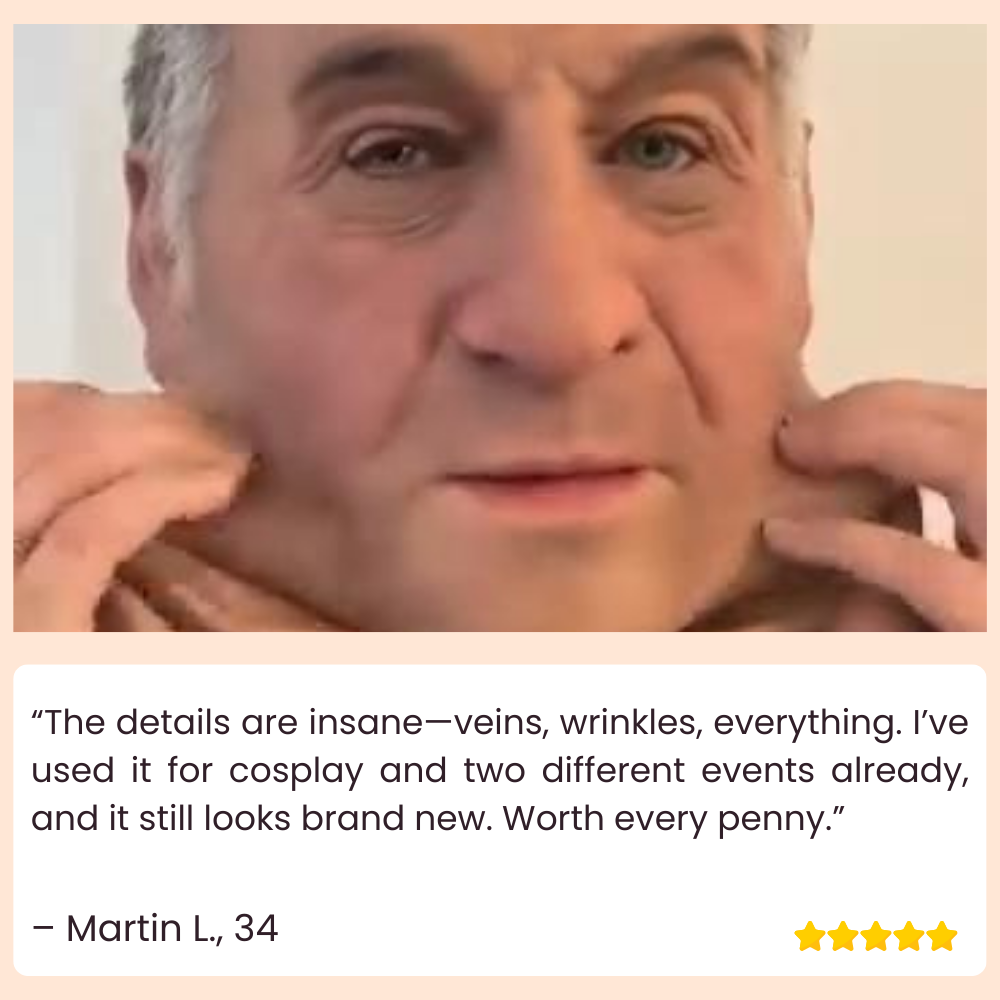 • Hyper-detailed work that fools even the closest eyes: Wrinkles, scars, veins, and stubble—they’re all here in murderous clarity, making your disguise shockingly authentic.